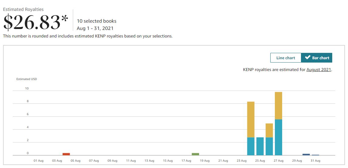 What you see in the above graph with the Gold and Blue, are Almost-Super Heroes 1 an 2. When book 1 dropped, I sold a few copies. When 2 dropped, I sold a few copies of book 2 and also a few copies of book 1. I had expected some of this, but I’m surprised at how well this month was. Honestly, I didn’t think that $100 goal was in reach. I see now, it very much is in reach.